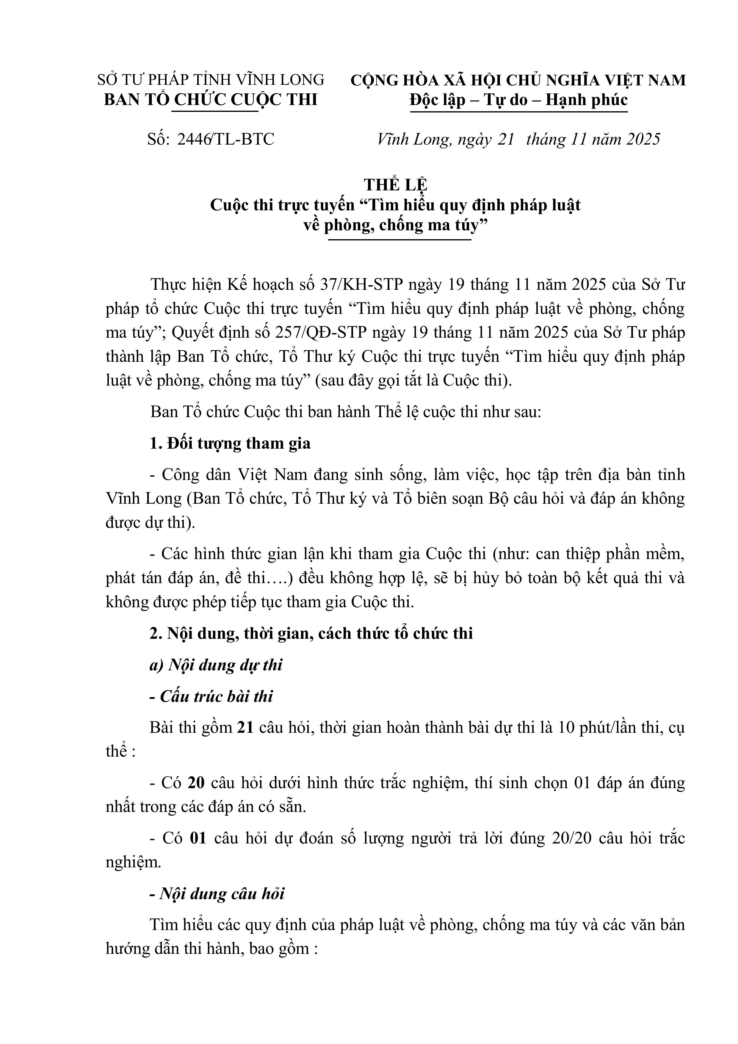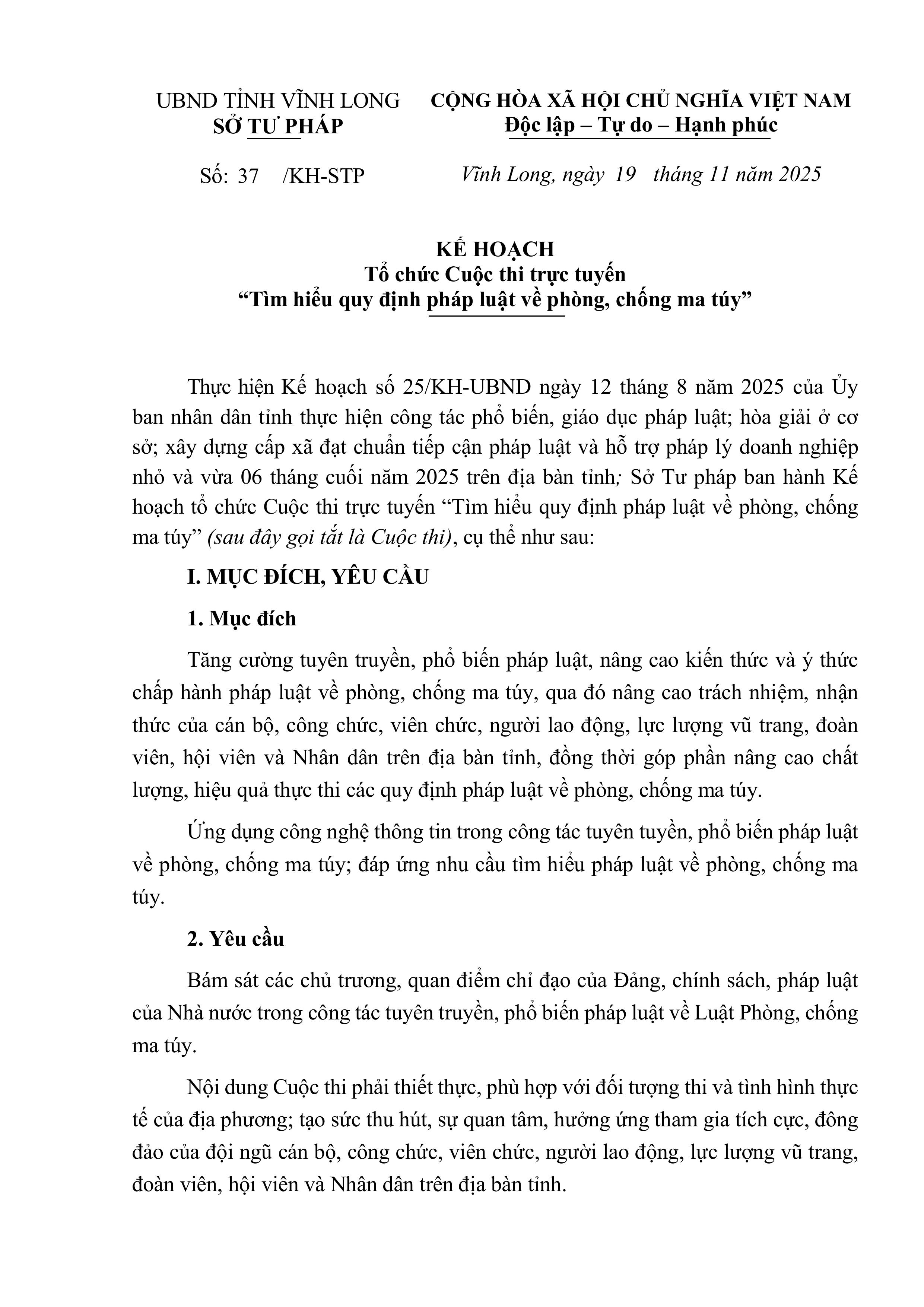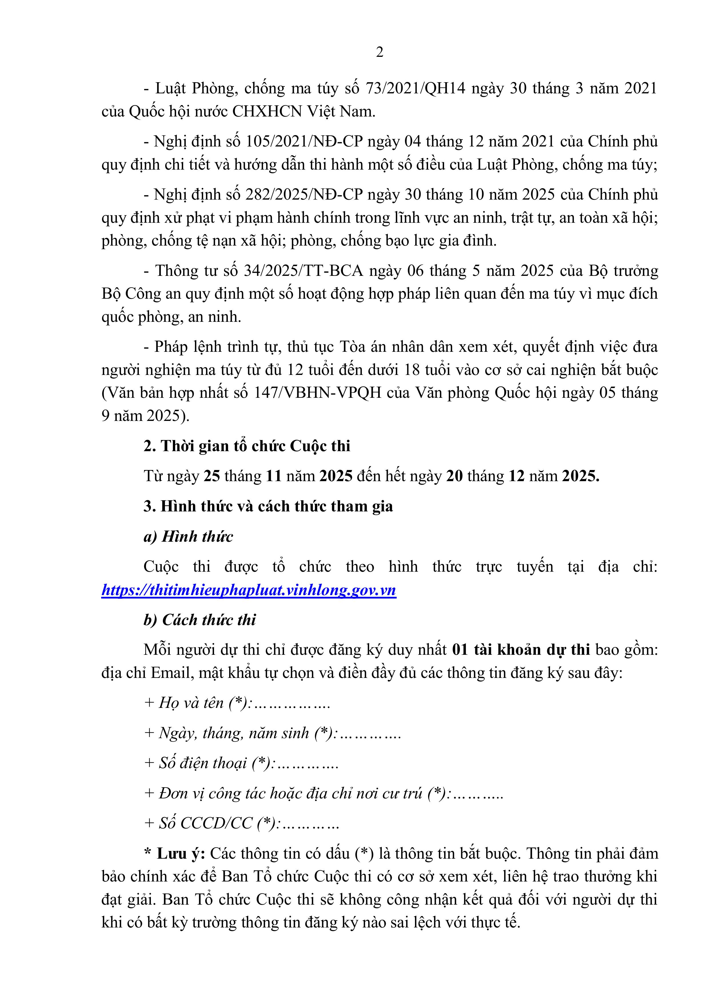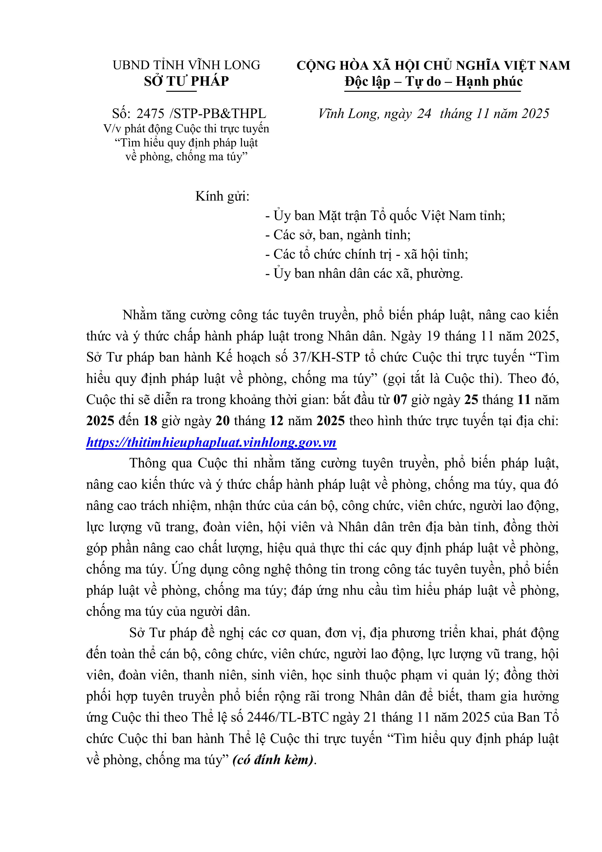 Thực hiện Công văn số 2475/STP-PB&THPL ngày 24/11/2025 của Sở Tư pháp tỉnh về việc phát động Cuộc thi trực tuyến "Tìm hiểu quy định pháp luật về phòng, chống ma túy" https://thitimhieuphapluat.vinhlong.gov.vn
