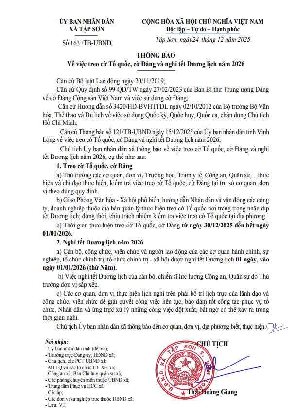 Thông báo về việc treo cờ Tổ quốc, cờ Đảng và nghỉ tết Dương lịch năm 2026