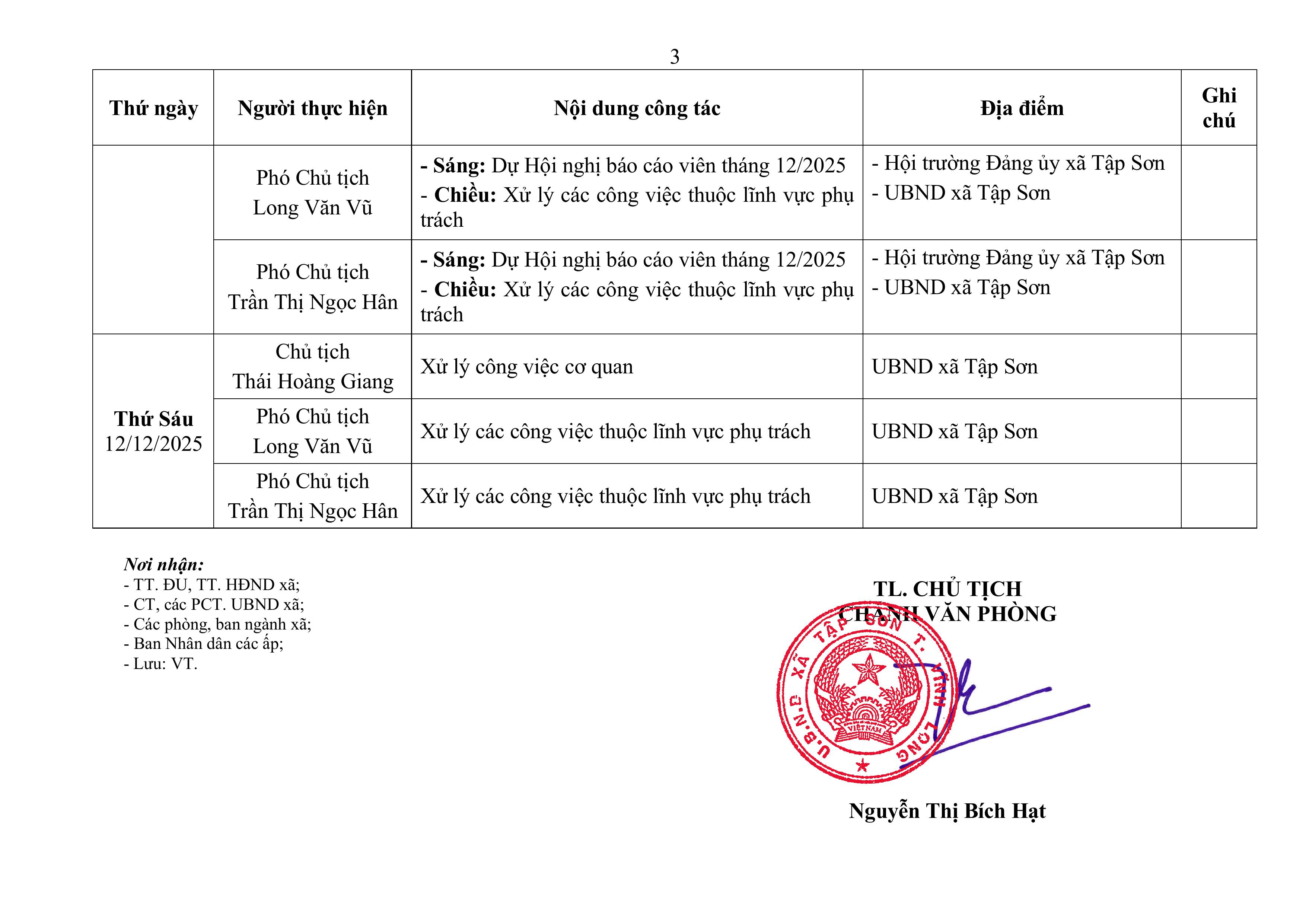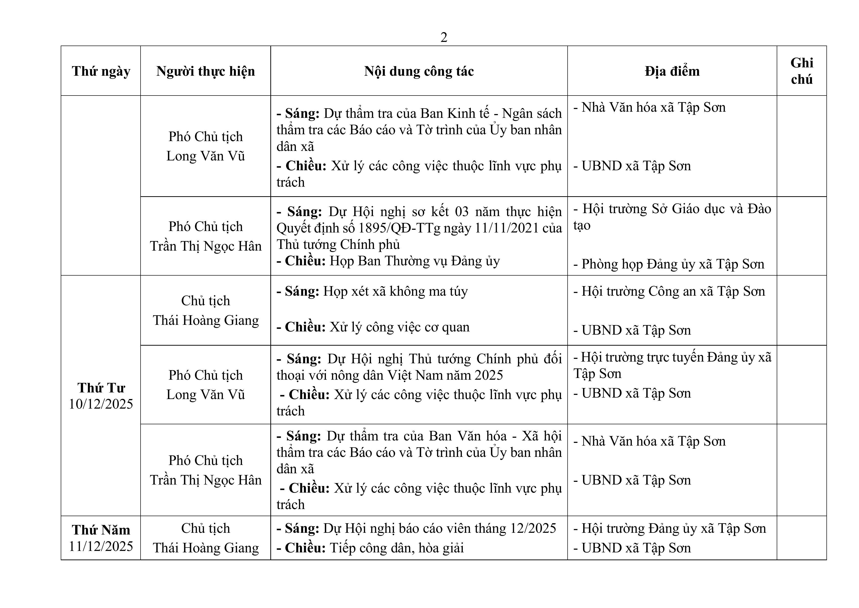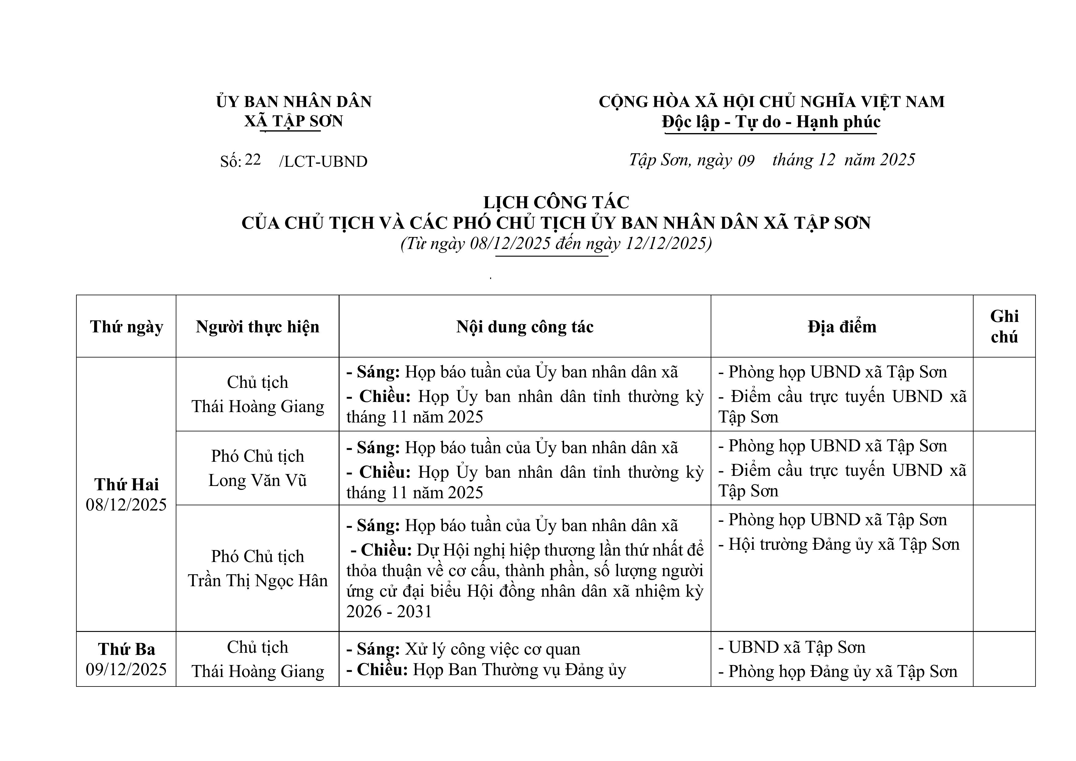 Lịch công tác của Chủ tịch và các Phó Chủ tịch UBND xã Tập Sơn từ ngày 08 đến ngày 12/12/2025