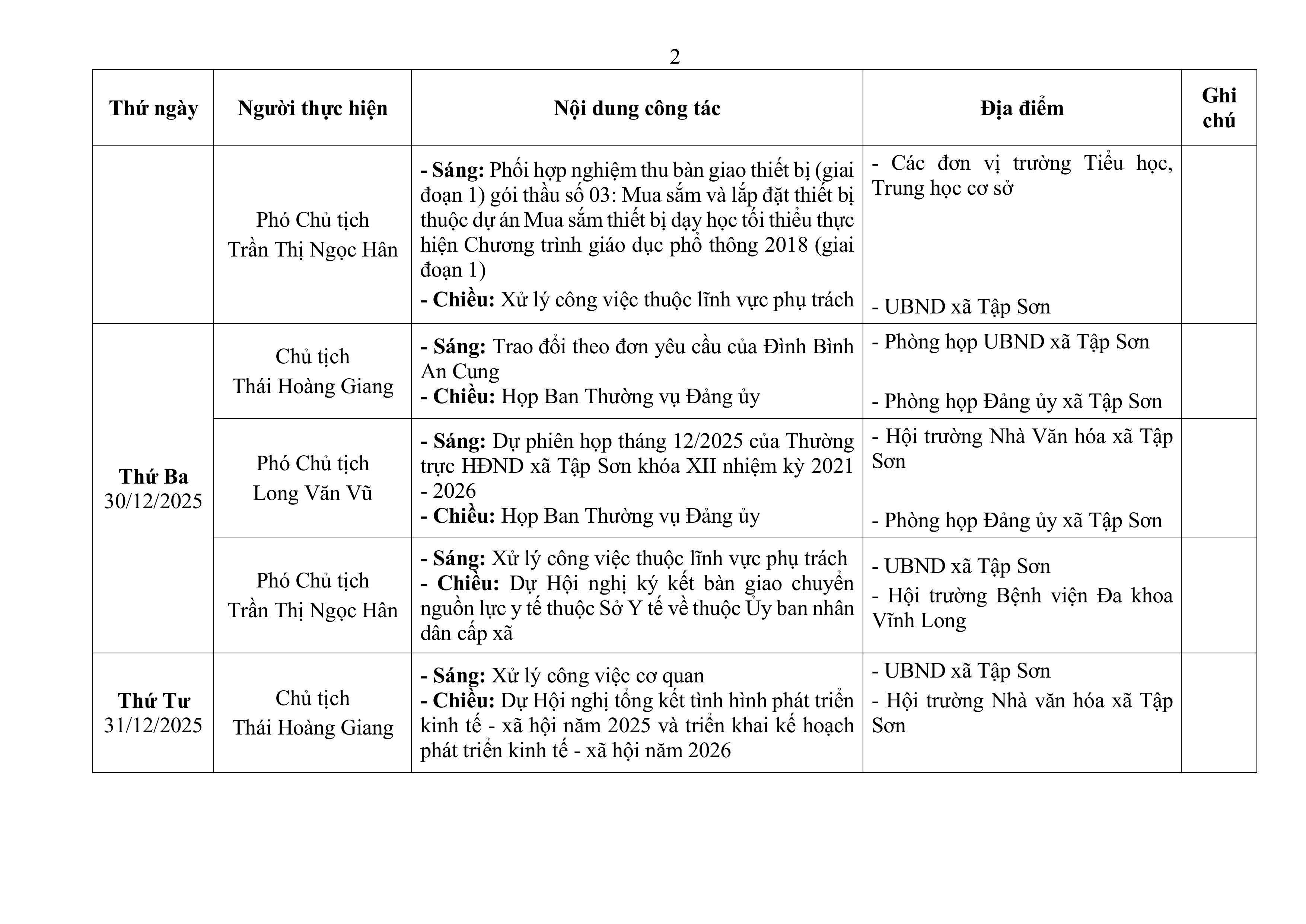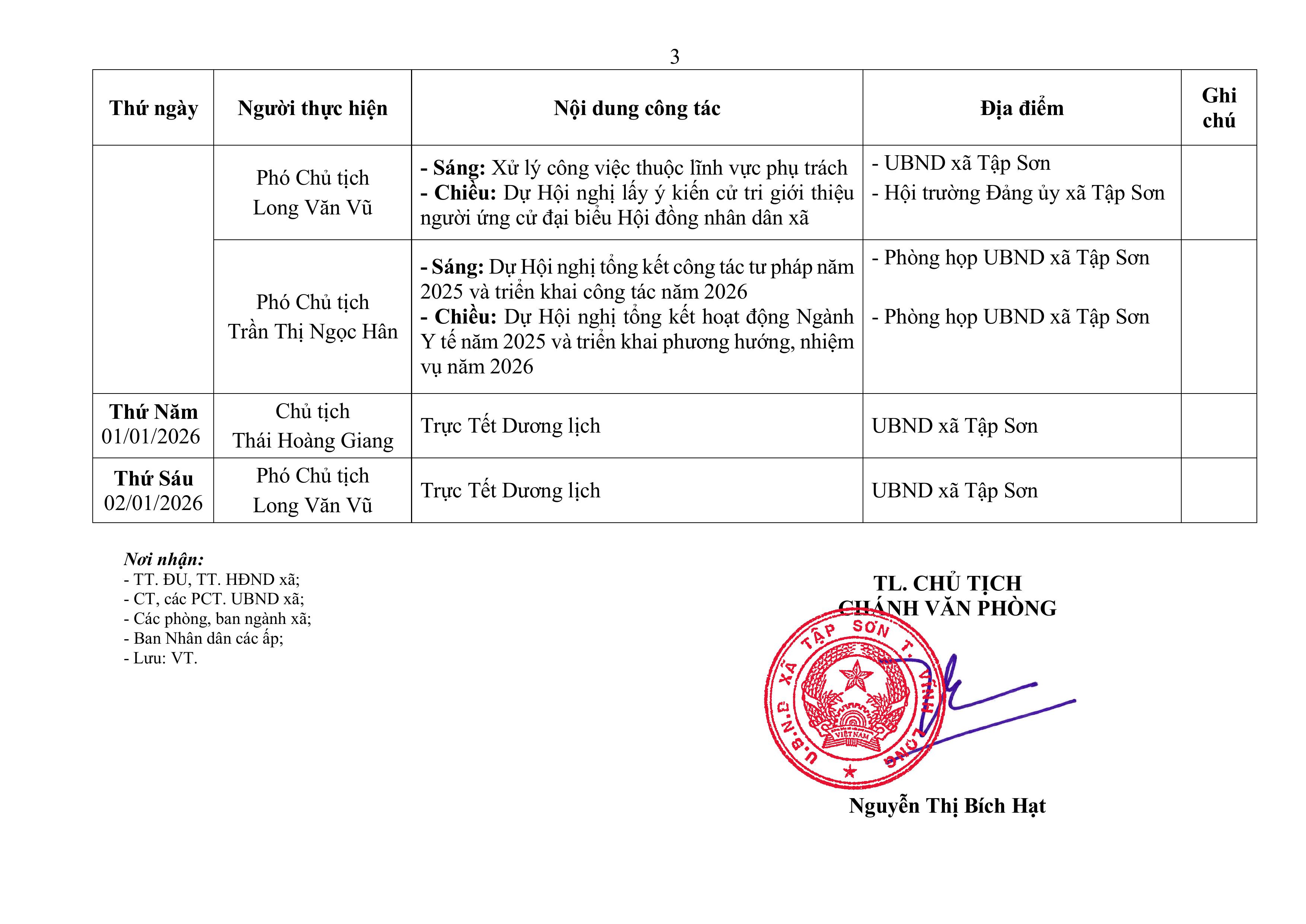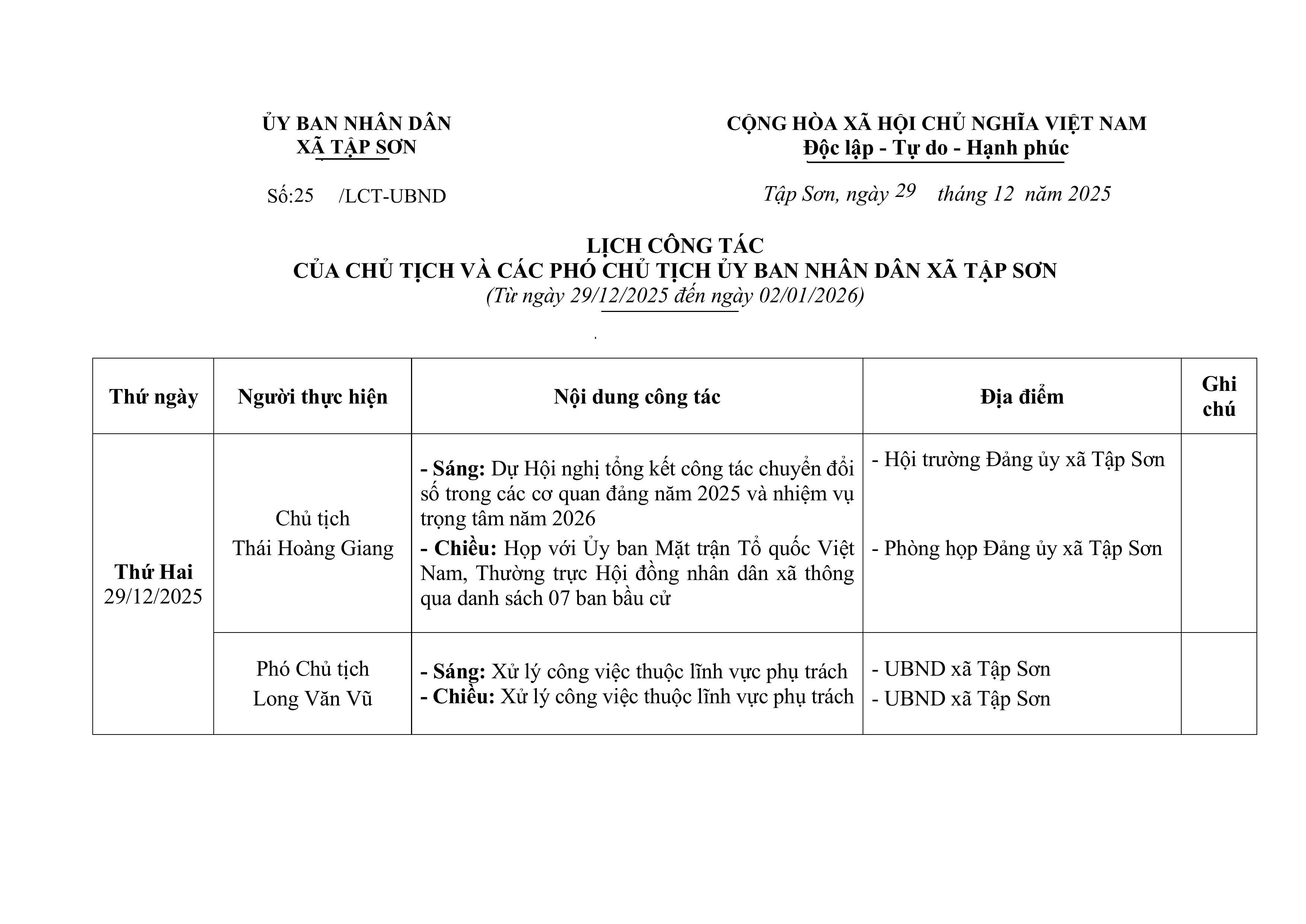 Lịch công tác của Chủ tịch và các Phó Chủ tịch UBND xã Tập Sơn từ ngày 29/12/2025 đến ngày 02/01/2026