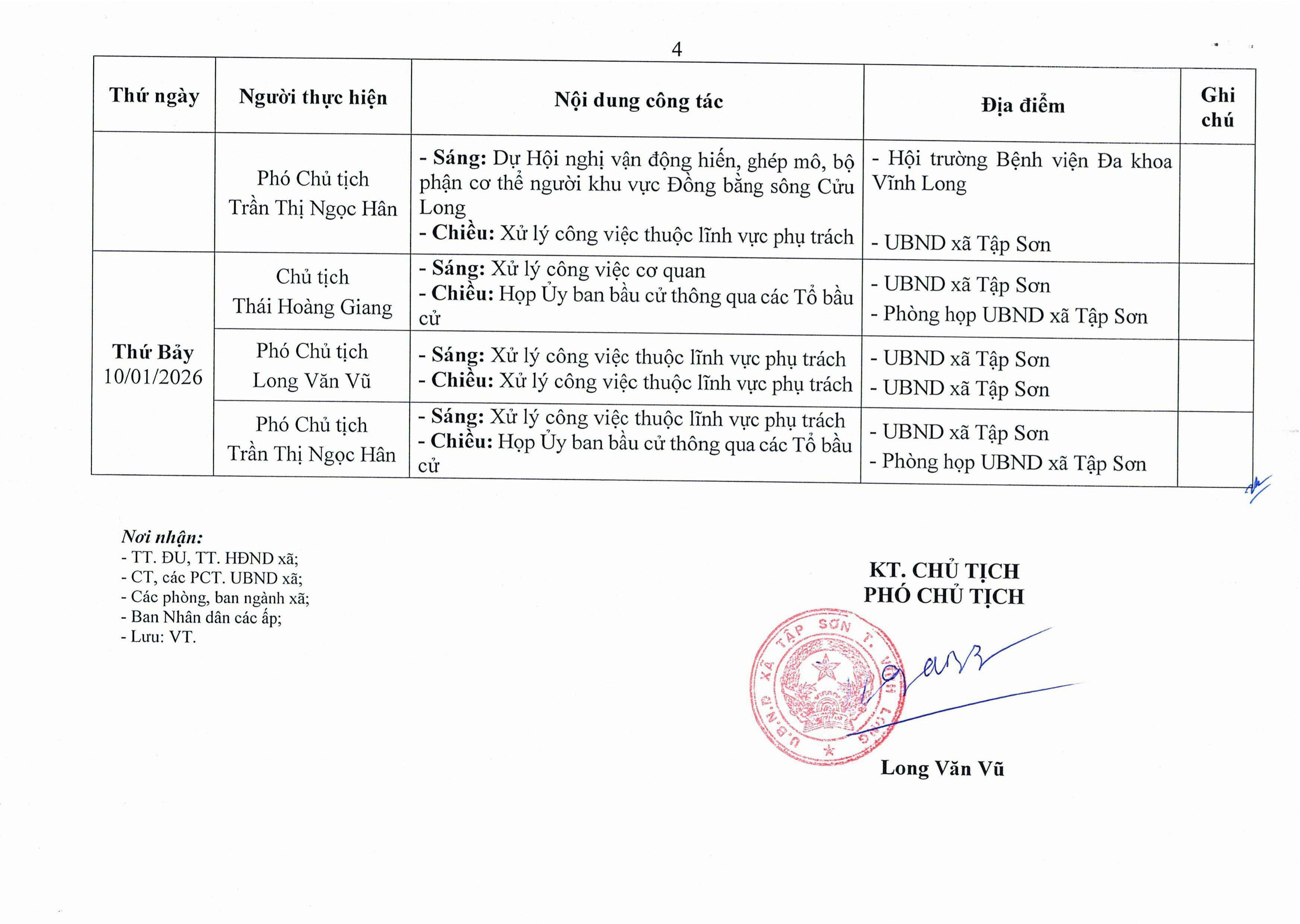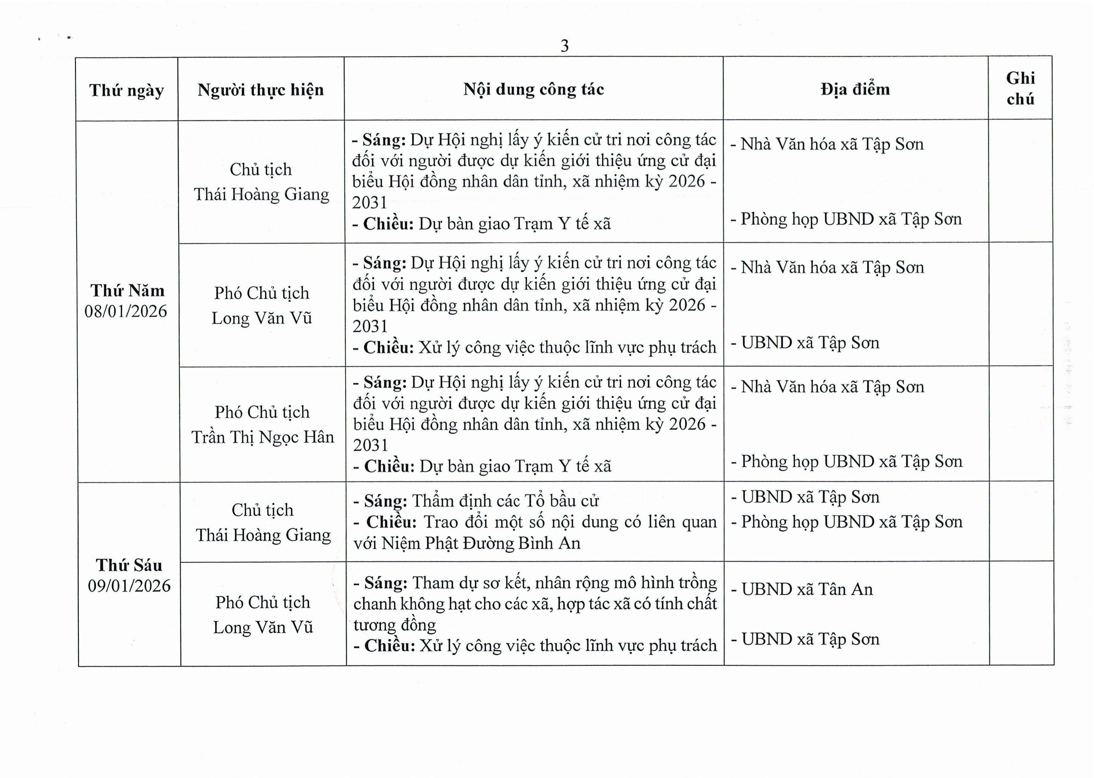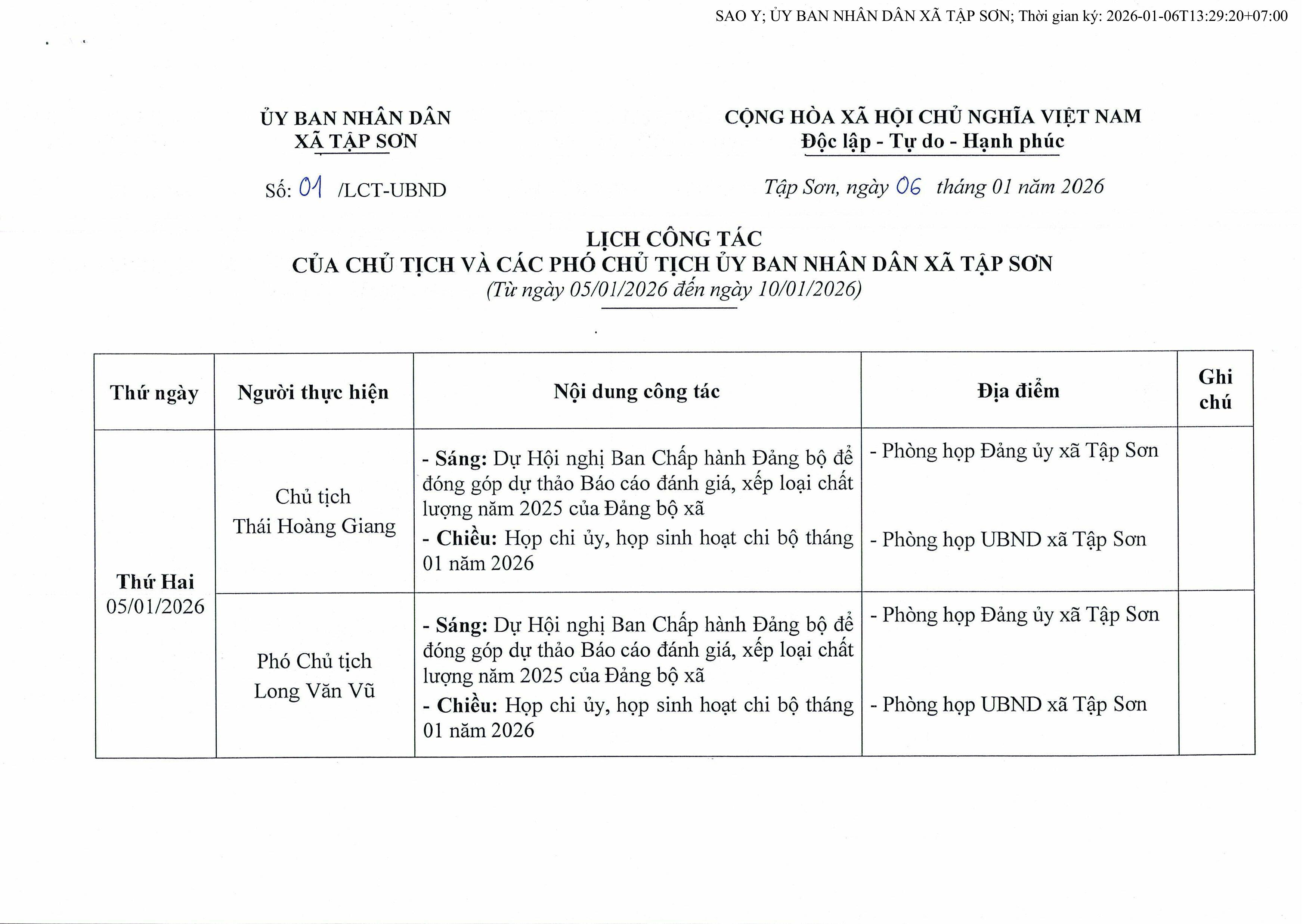Lịch công tác của Chủ tịch và các Phó Chủ tịch UBND xã Tập Sơn từ ngày 05 đến ngày 10/01/2026